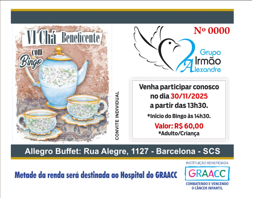 30 de Novembro • VI Chá Com Bingo Beneficente do Grupo Espírita Irmão Alexandre