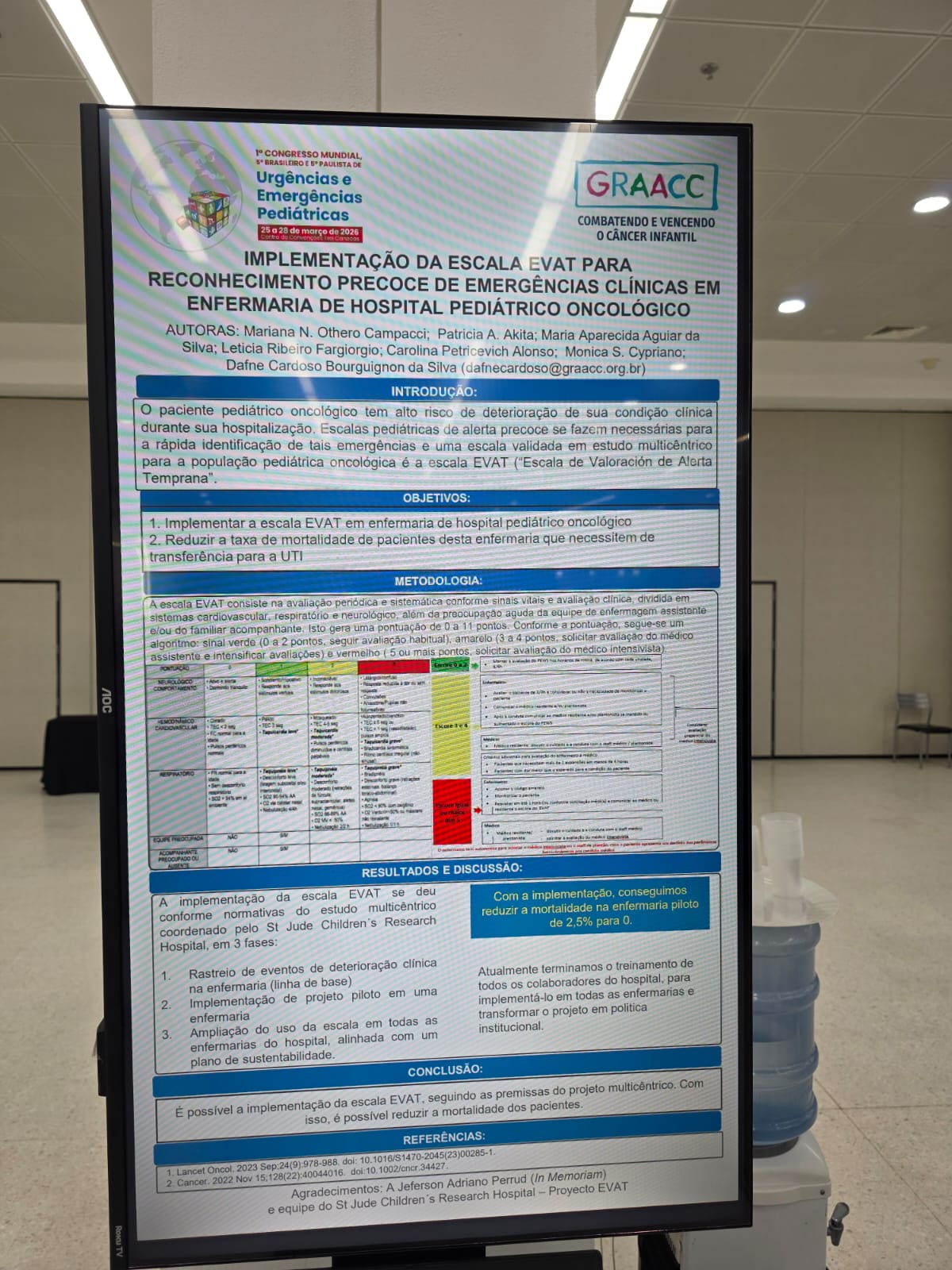 Na ocasião, a Dra. Dafne, que também é coordenadora da nossa UTI, apresentou um trabalho sobre nossa experiência com a escala EVAT para identificação precoce de urgências em enfermaria de oncologia pediátrica.
